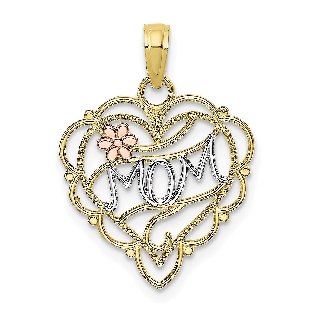 10k Two Tone Gold White Mom Scallop Love Heart Pendant Necklace With Pink Flower 21.3x16.2mm Wide-Pendant for Women