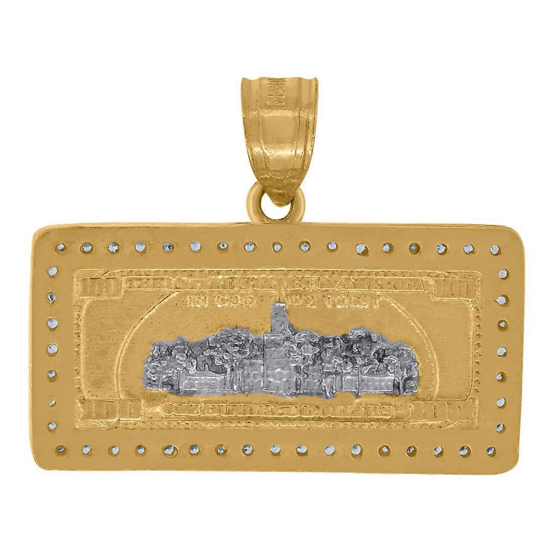 10k Two tone Gold Mens Cubic Zirconia One Hundred Dollar Bill Charm Pendant Necklace for Men