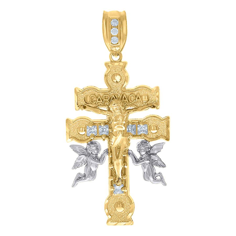 10k Two tone Gold Mens Princess Cut Cubic Zirconia Religious Caravaca Cross Crucifix Charm Pendant 49.9x24.4mm Wide Neck