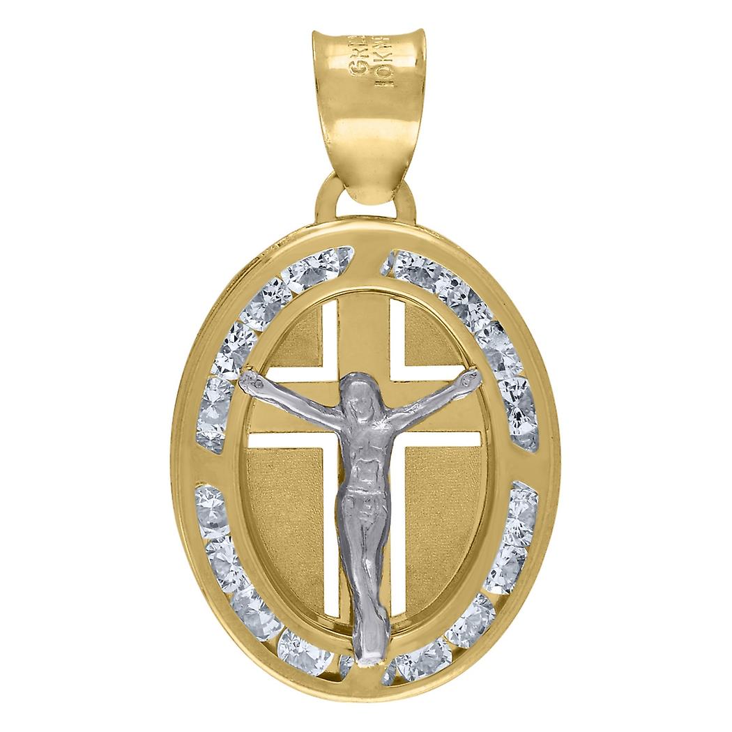 10k Two tone Gold Unisex Cubic Zirconia Crucifix Cross Religious Oval Charm Pendant Necklace 24x13.6mm Wide-Pendant for