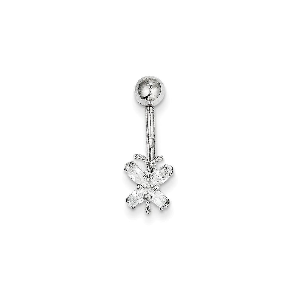 10k White Gold With Cubic Zirconia Butterfly Belly Ring Dangle - Measures 21x7mm Wide - in 10k White Gold - Product Attributes: - Open back - Polished - Screw back - - Width of Item: 7 mm - Length of Item: 21 mm - Feature: Hollow - - [ Potential Enhancement Methods: cubic zirconia ] - Synthetic. Some are covered with a product that makes the stone more durable. - [ Care and Handling: cubic zirconia ] - Clean with warm soapy water and a soft cloth. -