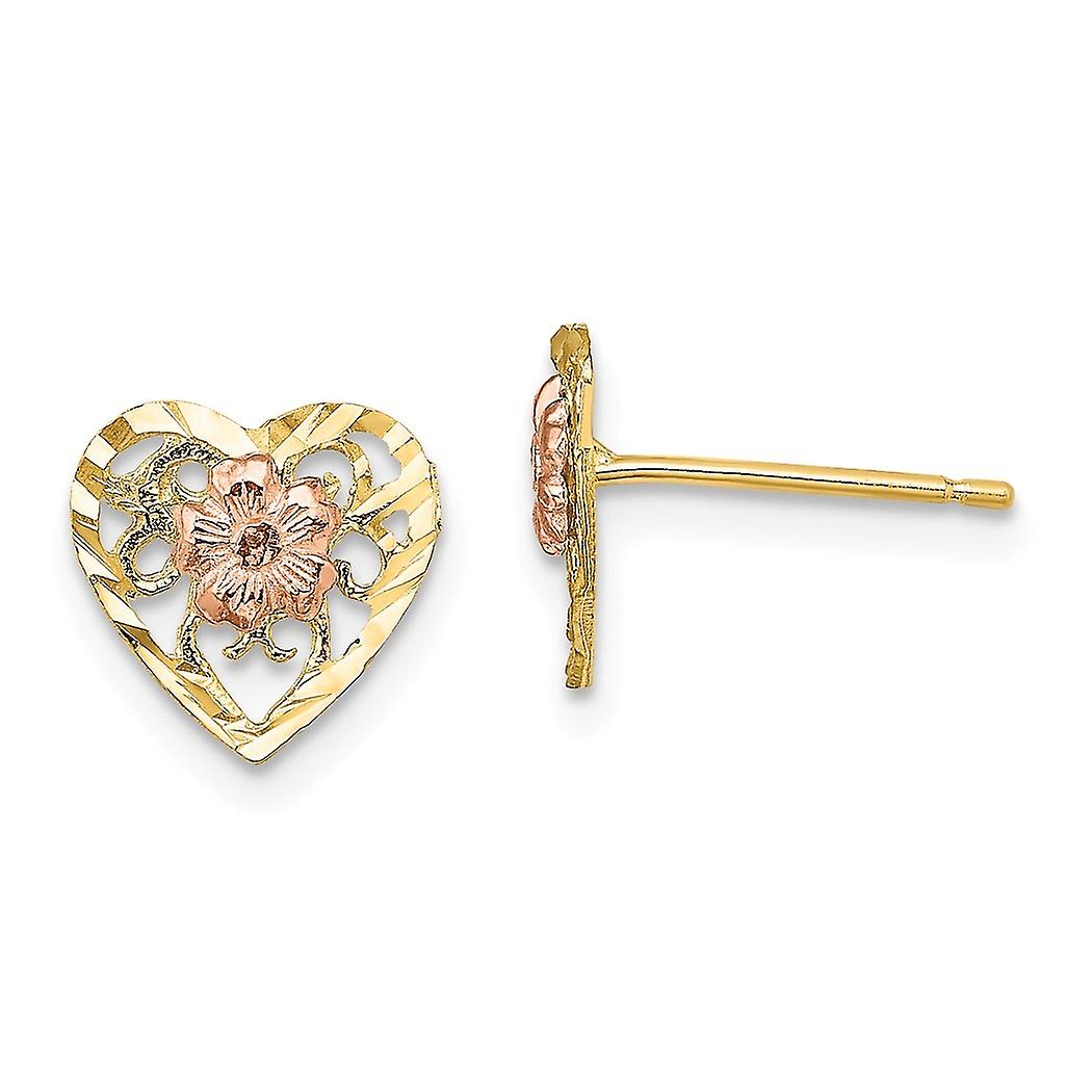10mm 14k Two tone Gold Sparkle Cut Love Heart Pendant Necklace Post With Pink Flower Center-Pendant for Women