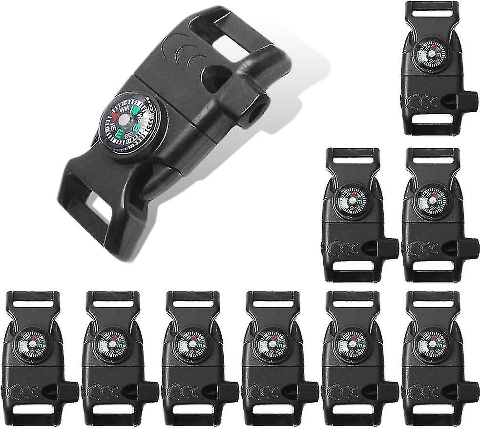10pcs Pack Black 5/8" Compass Flint Scraper Fire Starter Whistle Buckle Plastic Paracord Bracelet Outdoor Camping Emergency Survival Travel Kits (blac