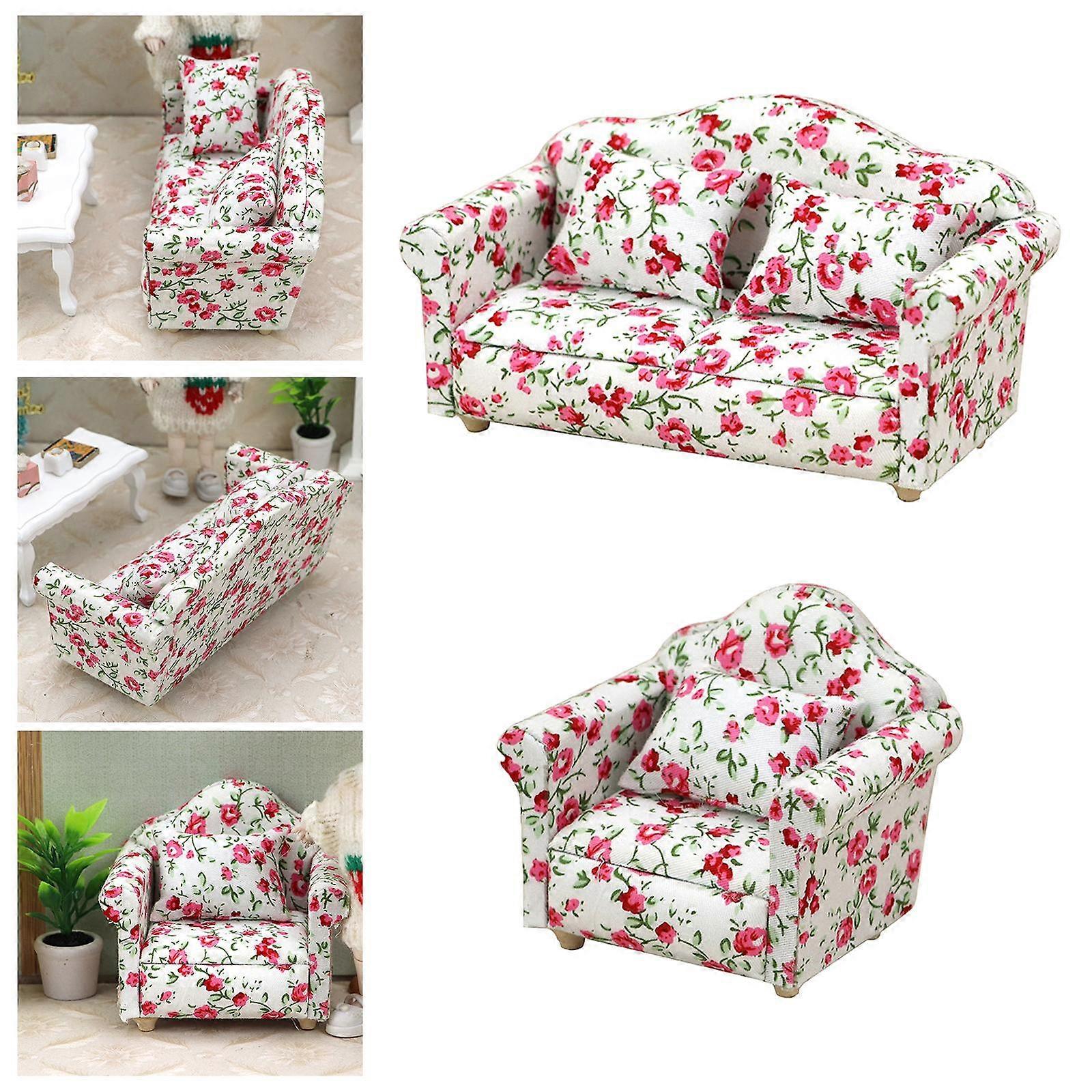 Wooden Floral Printed Sofa Set for 1/12 Dollhouse Toys Pretend Play DIY