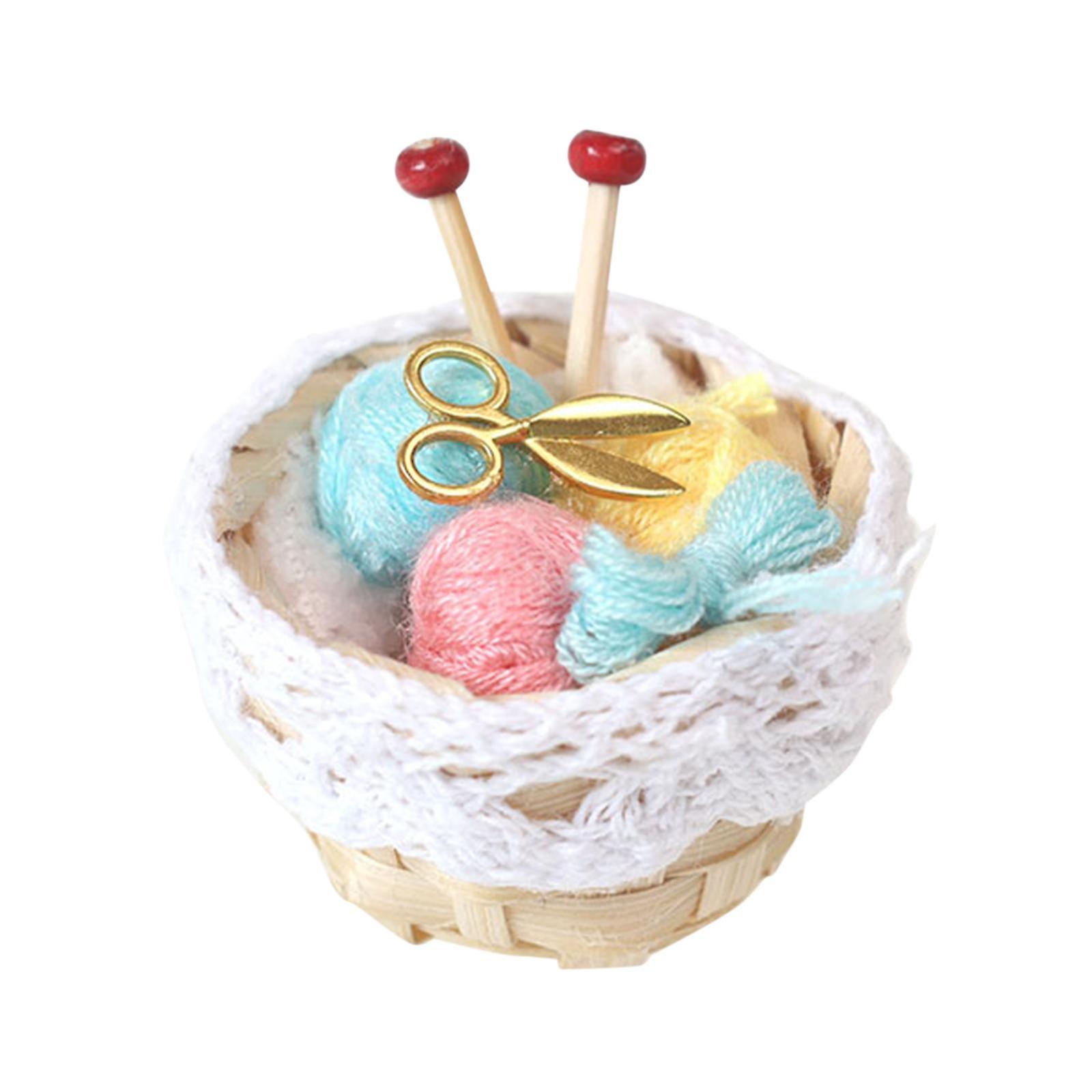 1/12 Dollhouse Woolen Yarn in Basket Knitting Yarn Miniature with Scissors Dollhouse Basket for Dollhouse Desktop Accessories