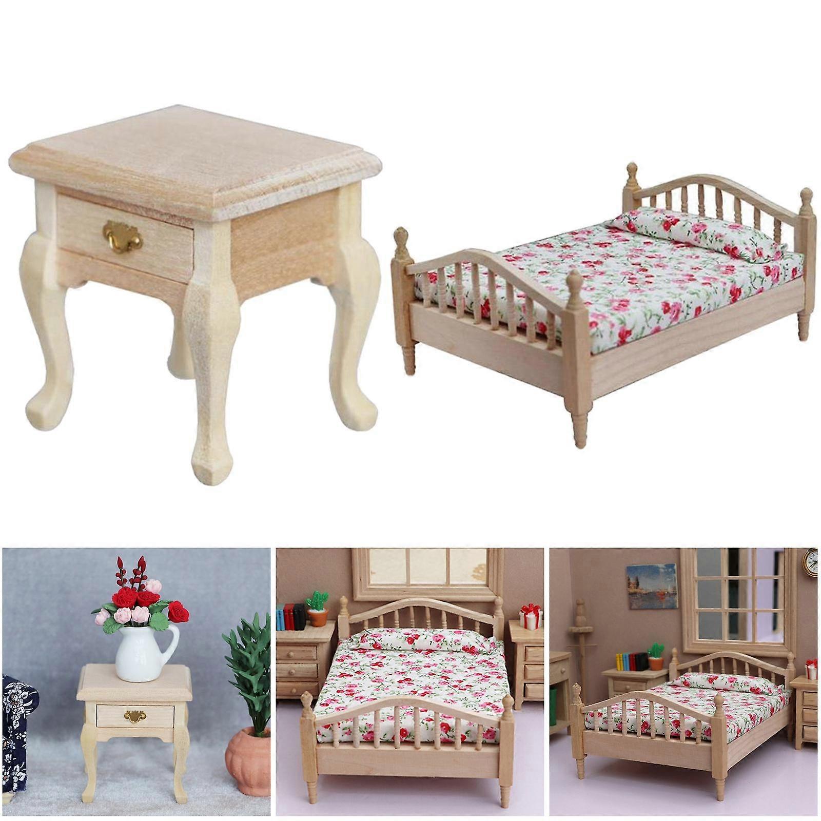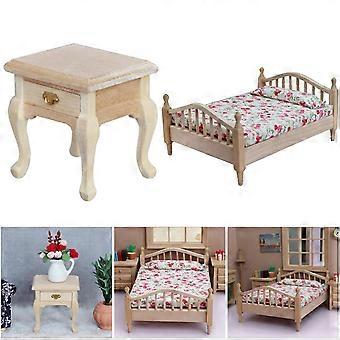 1:12 Dollhouse Mini Double Bed with Bedside Table Pretend Play Toy