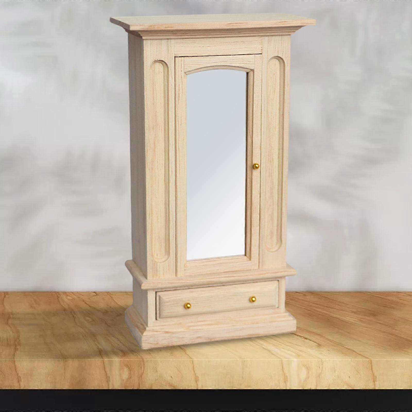 1/12 Dolls House Miniature Wardrobe, Unpainted Wood Closet with Mirror with Hanging Clothes Rod and Drawer for 1:12 Dollhouse Furniture Play Set