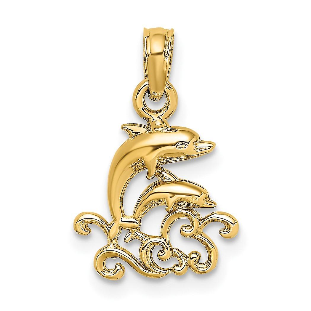 11.85mm 10k Solid Yellow Gold Textured Mini Double Dolphins and Waves Charm Pendant Necklace for Women