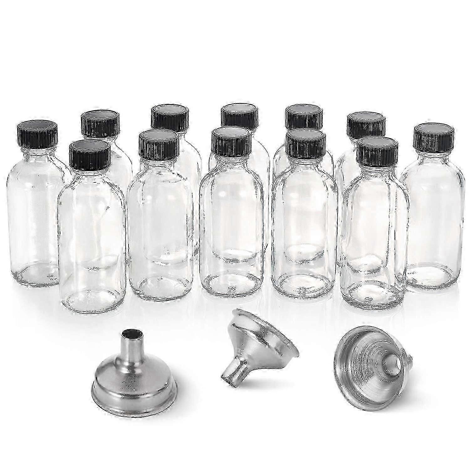 12, 2 Oz Small Clear Glass Bottles (60ml) With Lids 3 Stainless Steel Funnels - Boston Round Sample Bottles - Mini Travel Bottles, Leak-Proo