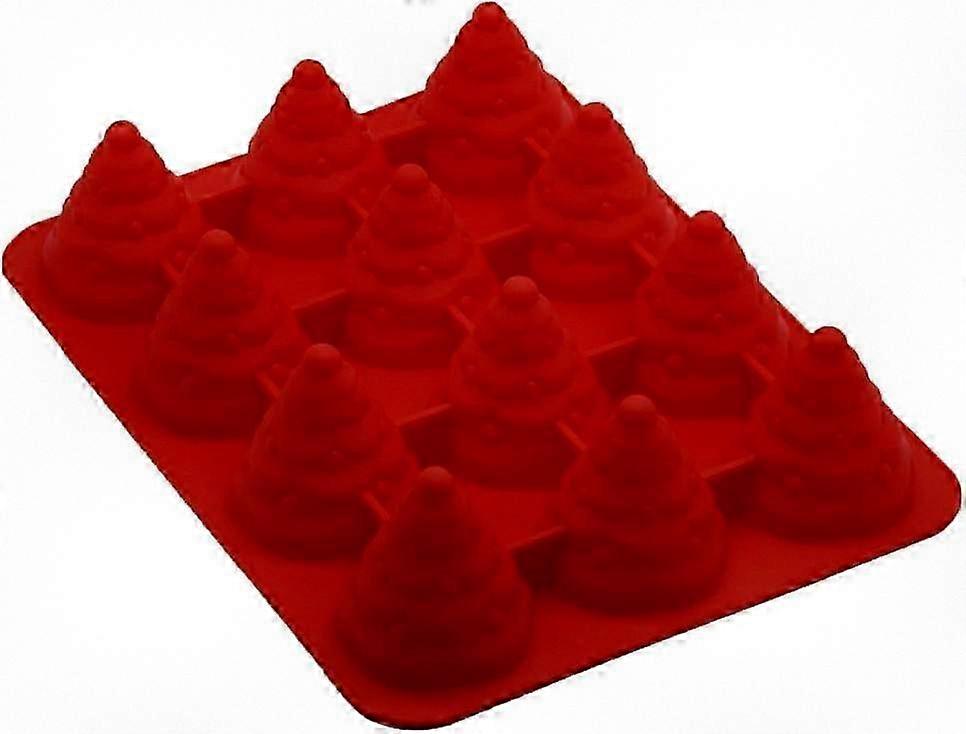 12-Cavity Red Silicone Cake Mold, Christmas Tree Design, Heat-Resistant Baking Tray for Festive Desserts.