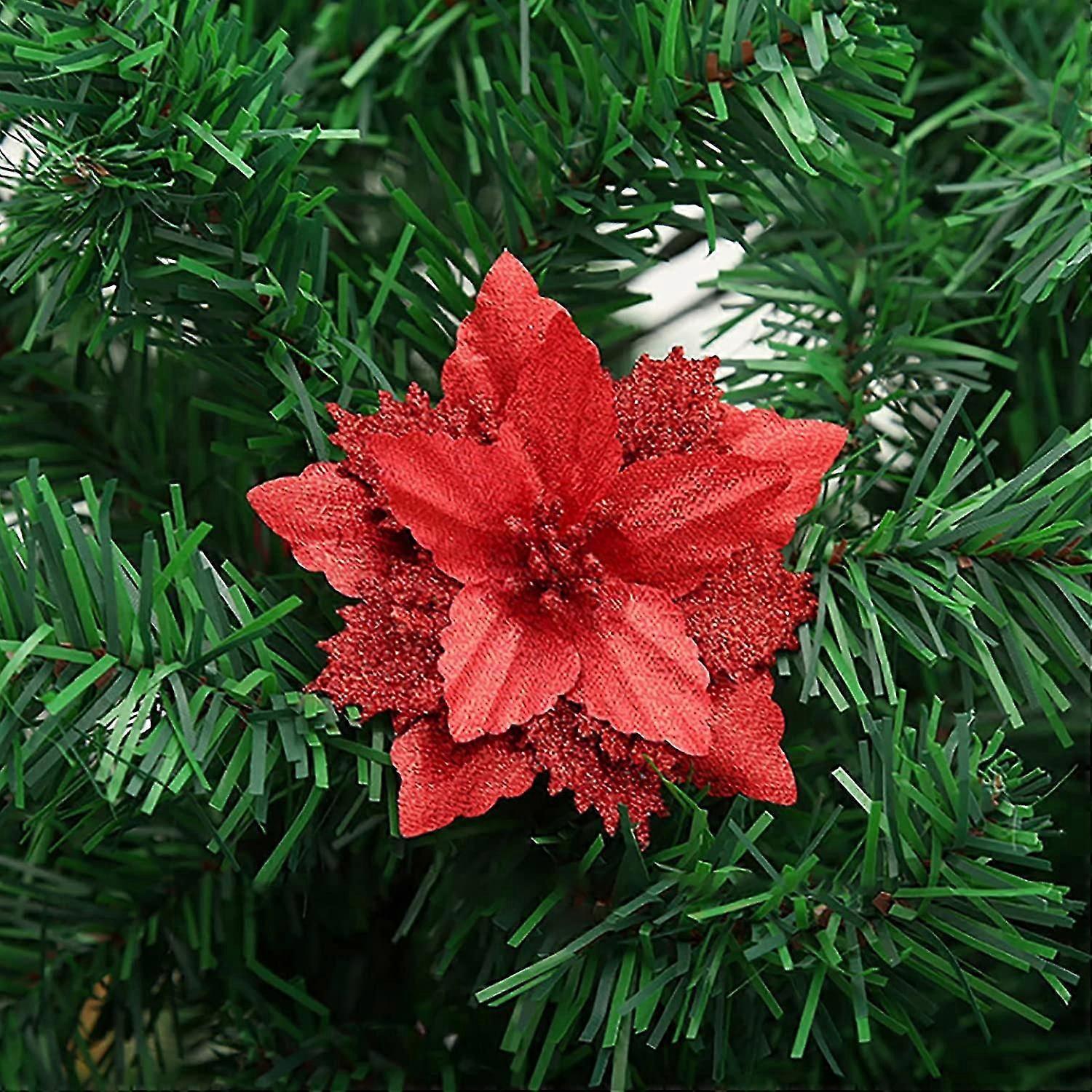 12 Pack Artificial Poinsettia Flowers For Double Layer Glitter Christmas Tree Decoration With Red A