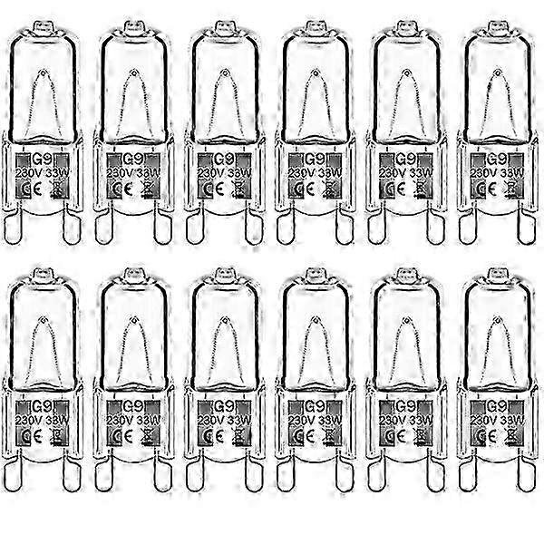 What you can get: 12 Pack 230V 33W G9 halogen bulbs Comfortable brightness: 380lm 2800K warm white light, enough to light up your room without too much glare. Do not emit harmful radiation. No UV or IR. Long life: The G9 lamp can work for 2000 hours. CE RoHS certification. G9 Base: With standard G9 base, it is easy for you to install the bulbs and then enjoy the beautiful light. Wide application: the halogen lamp can be applied for downlights indoors, bedroom wardrobe, counters, table lamp, ceiling fixture, etc. Note: Due to the light and screen setting difference, the item's color may be slightly different from the pictures. Please allow slight dimension difference due to different manual measurement.