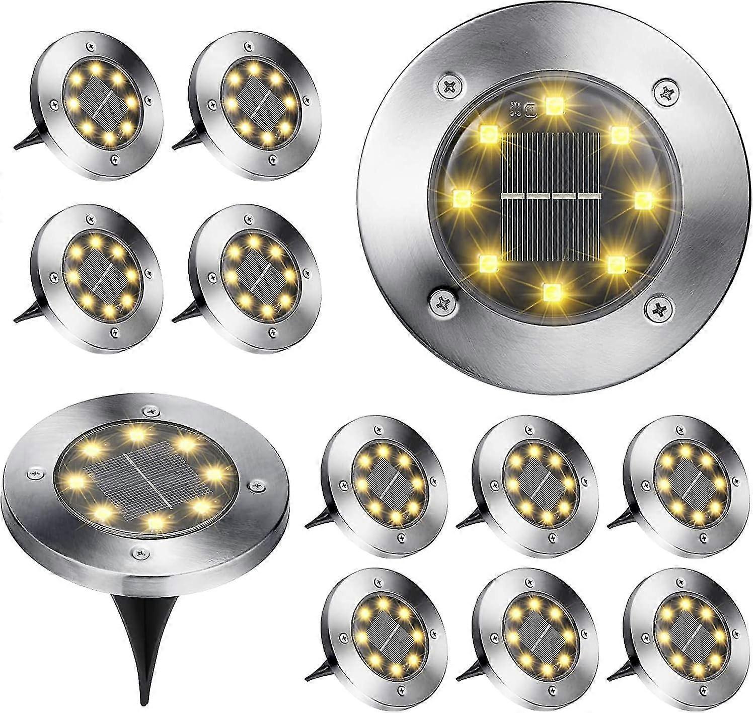 12 Pcs 8 Led Beautifully Designed Steel Ground Solar Light Outdoor Warm White, It Can Give A Charming And Decorative Glow To Garden, Lawns And Paths, While Providing Safety And Security. And Visibility The Night. Auto On/Off Solar Lights Can Automatically Turn On At Low Temperature. Darkness And Turn Off At Dawn. A Perfect Garden Decoration And Bright Lighting On Your Way In The Evening. Waterproof And Durable Ip65 Waterproof, Made Made Of High Quality Stainless Steel And Abs, Suitable For To Outdoor Use, Especially For Rainy Days. (Please Do Not Throw The Outdoor Solar Lights Directly Into Water) Perfect Garden Decor Outdoor Solar Lights Do Not Require Wiring And Are Easy To Install. Install. A Good Choice For Garden, Lawn, Path, Pond, Walkway, Yard, Street, Stairs, Balcony, Hallways, Etc. Features: Lighting Type: Led Color: Warm White 3000K Material: Stainless Steel And Abs Waterproof Level: Ip65 Solar Panel: 2V 100Ma Charging Time: 6-8 Hours Working Time: 8- 10 Hours Rechargeable Ni-Mh Battery: 600Ma Product Size: 11.5 * 13 Cm / 4.5 * 5.1 Inch Note: 1. Solar Lights Should Be Fully Charged By Sunlight About 8 Hours Hours Before First Use. 2. Please Remove The Protective Film From The Solar Panel And Make Sure The Switch Is "On" To Charge In The Sun. 3. If The Ground Is Too Hard, Please Loosen It First To Avoid Twisting The Solar Path Lights. 4. Please Make Sure The Solar Panel Can Receive Direct Sunlight Without Any Shelter Or Glass.-3