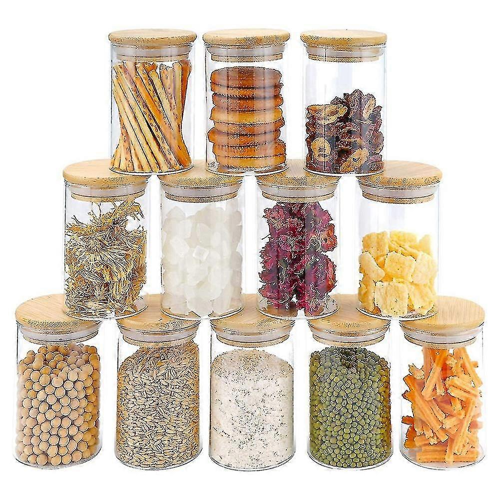 Size:6.5x10cm, Capacity:300ml.small glass jars set can help you to sort and store a lot of items and make your room clean and beautiful.[High Quality Materials]The airtight glass jar set is made of Bamboo + glass.These cute glass containers are thicker than other jars.There is a silicone ring on the bamboo lid will not make a sound and scratch the jar when the lid is opened.This glass tank can be heated to 150 degrees Celsius with an open or freeze to 20 degrees Celsius.[Keep Freshness Moistureproof]The bamboo wood lids with all-round silicone sealing loop creates an airtight and moistureproof environment to keep your the contents and dry. Looks great, too.[Easy to Clean]The crystal glass allows you to see what is inside and easily monitor whether your food has run out. Glass containers can be placed in the dishwasher for cleaning and placed in the refrigerator and microwave, while wooden lids can be wiped with cloth.[Widely Application]bamboo cover is sealed with a rubber ring for high confidentiality, perfect for storing wet (gravy / / cut fruit) or dry food (beans / rice / pasta), baked goods (flour / powder / salt / sugar), biscuits, cereals, tea and spices or other ingredients. It not only stores food , but also saves space in the kitchen.Colour:as shown(Transparent+ wood color)Material:Bamboo + glassPackage Contents:12 * Glass JarsOnly the above package content, other products are not included.Note: Light reflection and different displays may the color of the item in the a little different from the real thing. The measurement allowed error is +/- 1-3cm.