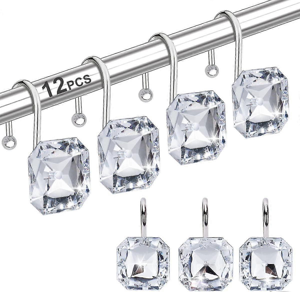 12pcs Shower Curtain Hooks Rings for Bathroom, Stainless Steel Rust Resistant Decorative Rhinestones Square Clear Shower Hooks Hangers