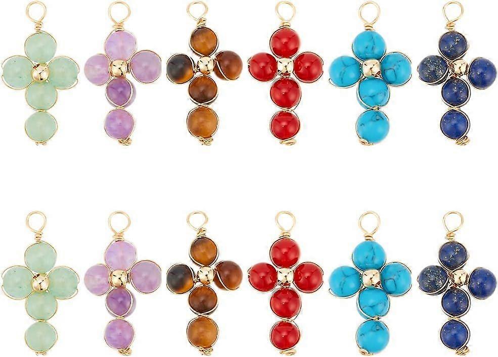 12Pcs 6 Styles Natural Stone Pendants Cross Shape Chakra Crystal Charm with Brass Beads Gold Copper Wire Wrapped Gemstone Pendants Crystal Healing Sto