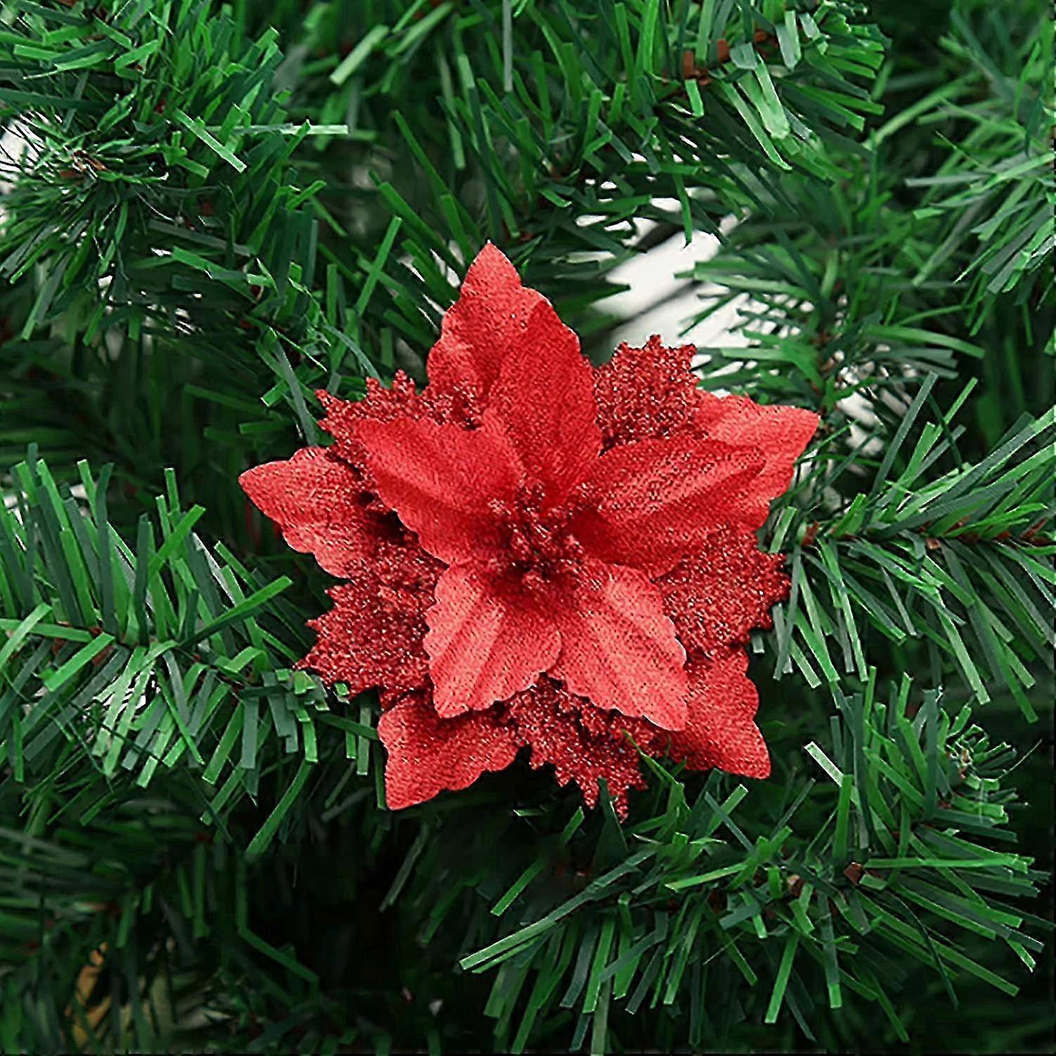 12 Pack Glitter Poinsettia Artificial Flowers for Double Layer Christmas Tree Decoration in Red