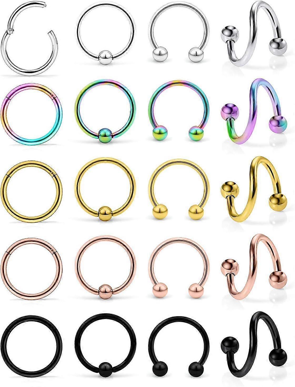 TOTAL 20PCS PIERCINGS: 5Pcs Hinged Segment Clicker, 5Pcs Twisted Barbell, 5Pcs Horseshoe Barbell, 5Pcs Captive Bead Ring. Affordable Set, More Choices for Everyday Wear. MULTIFUNCTIONAL USE: : Our Piercings Can Be Used As Helix Hoop Earring, Daith Earring, Rook Earring, Tragus Earring Hoop, Cartilage Piercing Jewelry, Septum Jewelry, Helix earrings, Lip Rings Or Other Piercings. Unisex Design, Perfect For Women Or Men, Also A Good Option To Send As Gifts for Birthday, Christmas Day, Anniversary Day, Valentine's Day and More. AFTERSALE SERVICE: All Items Are New And Unused. Packed In A Velvet Pouch. Please Contact Us If You Have Any Problem. SIZE REFERENCE: Gauge Size: 16G (1.2mm); Inner Diameter: 10mm (3/8inch); Ball Diameter: 3mm; Color: Silvertone, Rose Gold, Goldtone, Black, Rainbow. SAFE MATERIAL: Made of High Quality Surgical Stainless Steel with Great Electroplated, No Rust, No Corrosion, Providing You Longertime Color Retention, Safe for Most Part of People to Wear. High Polished Smooth Surface. Easy To Put On or Take off. Comfortable To Wear.