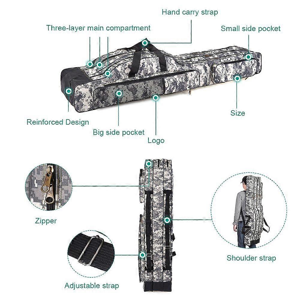 Feature:1. SPACIOUS CAPACITY: This fishing bag includes 3 main compartment, 2 zippered front pockets and 1 mesh pocket, offers large capacity for your fishing tackle and keeps it neat and organized.2. EASY ACCESS \u0026 ORGANIZATION: 3 spacious main compartment with wide opening and dual zippers for easy access to your essential fishing gear, such as fishing rod, fishing reel, line, tackle box, etc.3. ADDITIONAL STORAGE: 2 Front zipper pockets for additional storage for your fishing tackles like lures, tackle, bait and more. Breathable mesh pocket to hold your fishing gloves or towels.4. LONG LASTING: Made of high quality 600D oxford cloth, tear-resistant and water repellent.5. PORTABLE: With carrying handle and adjustable shoulder strap, convenient to carry. It is also foldable for easy storage and transport, great fishing luggage for any angler.Specification:This fishing rod bag may be the simplest bag to hold you fishing rods, reels and other tackles. It has three main big compartments, 2 front pockets and 1 mesh pocket, which is very roomy to keep your fishing tackle neat and ready to go. Features:SPACIOUS CAPACITY: This fishing bag includes 3 main compartment, 2 zippered front pockets and 1 mesh pocket, offers large capacity for your fishing tackle and keeps it neat and organized.EASY ACCESS & ORGANIZATION: 3 spacious main compartment with wide opening and dual zippers for easy access to your essential fishing gear, such as fishing rod, fishing reel, line, tackle box, etc.ADDITIONAL STORAGE: 2 Front zipper pockets for additional storage for your fishing tackles like lures, tackle, bait and more. Breathable mesh pocket to hold your fishing gloves or towels.LONG LASTING: Made of high quality 600D oxford cloth, tear-resistant and water repellent.PORTABLE: With carrying handle and adjustable shoulder strap, convenient to carry. It is also foldable for easy storage and transport, great fishing luggage for any angler.Specifications:Material: 600D fabricLength: 120cm / 150cm (optional)Color: City camouflage / Tree camouflage (optional)Weight: 1050g - 1210g / 2.3lb - 2.7lbPackage List:1 * Fishing BagPackage List:1 * Fishing Bag