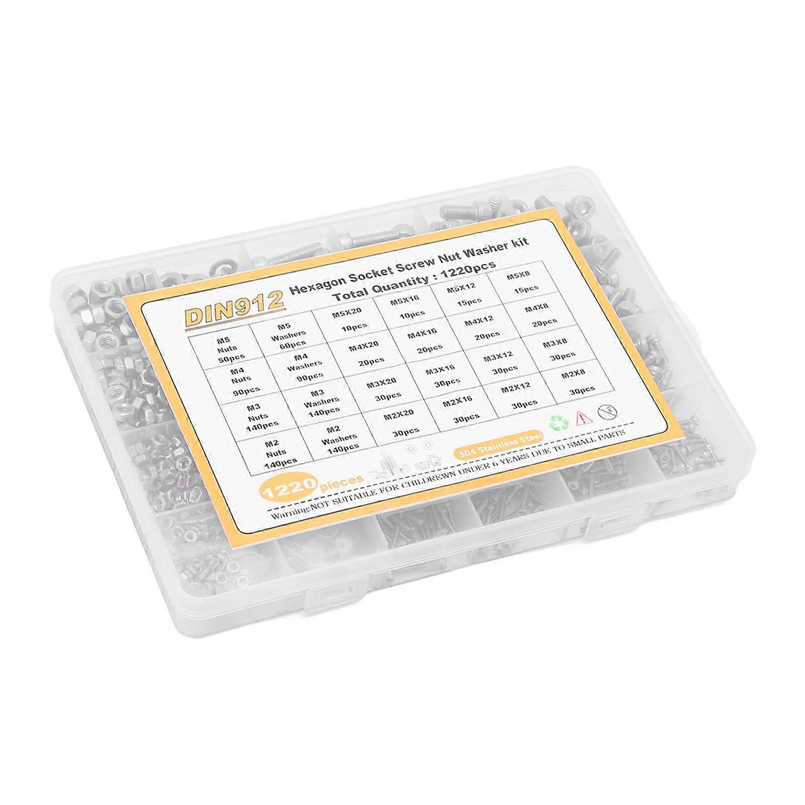 1220Pcs Screw Nut Washer Assortment M2 M3 M4 M5 Round Head Hex Socket Stainless Steel Fastener