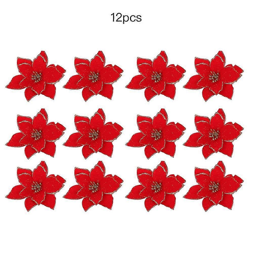 12pcs Glitter Poinsettia Christmas Tree Decoration Flowers - Golden,Glossy Red