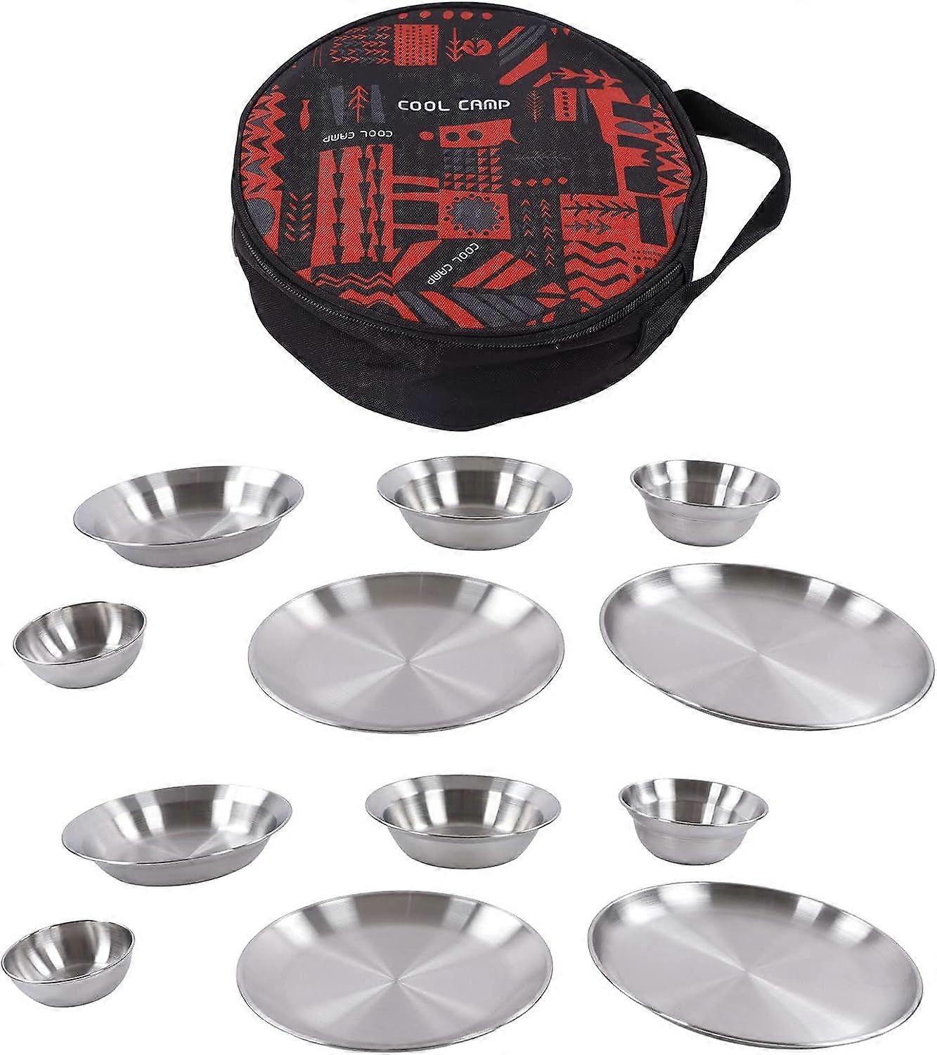 12PCS Stainless Steel Camping Dish Set with Storage Bag, Plates and Bowls for Outdoor Hiking