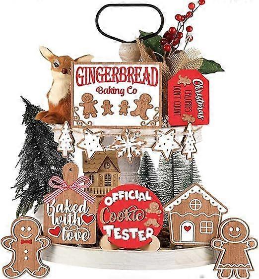 12PCS Wooden Tiered Tray Decor Christmas, Ginger Man Farmhouse Home Decor Wooden Signs, Holiday Party Table Centerpieces Mantle Fireplace Shelf Winter