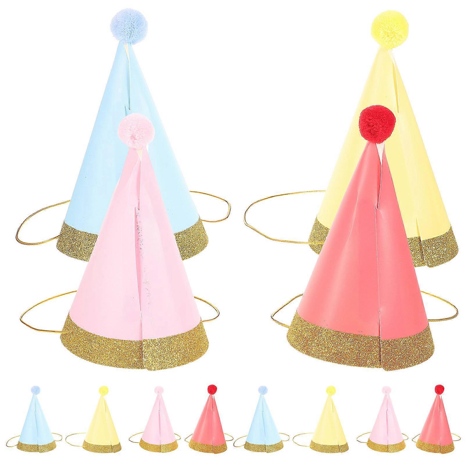 12pcs Pomp Kids Birthday Hat Glitter Party Golden Rim Photo Props for Children Decoration (Pink, Red, Yellow, Blue Each Three)