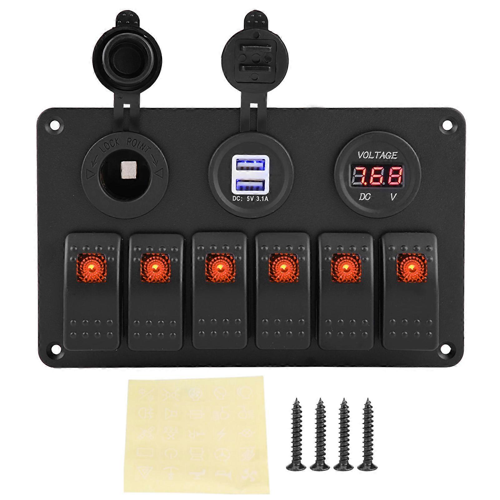 12V 24V 6 Gang Car Boat LED Rocker Switch Panel Dual USB Voltmeter Cigarette Lighter Orange