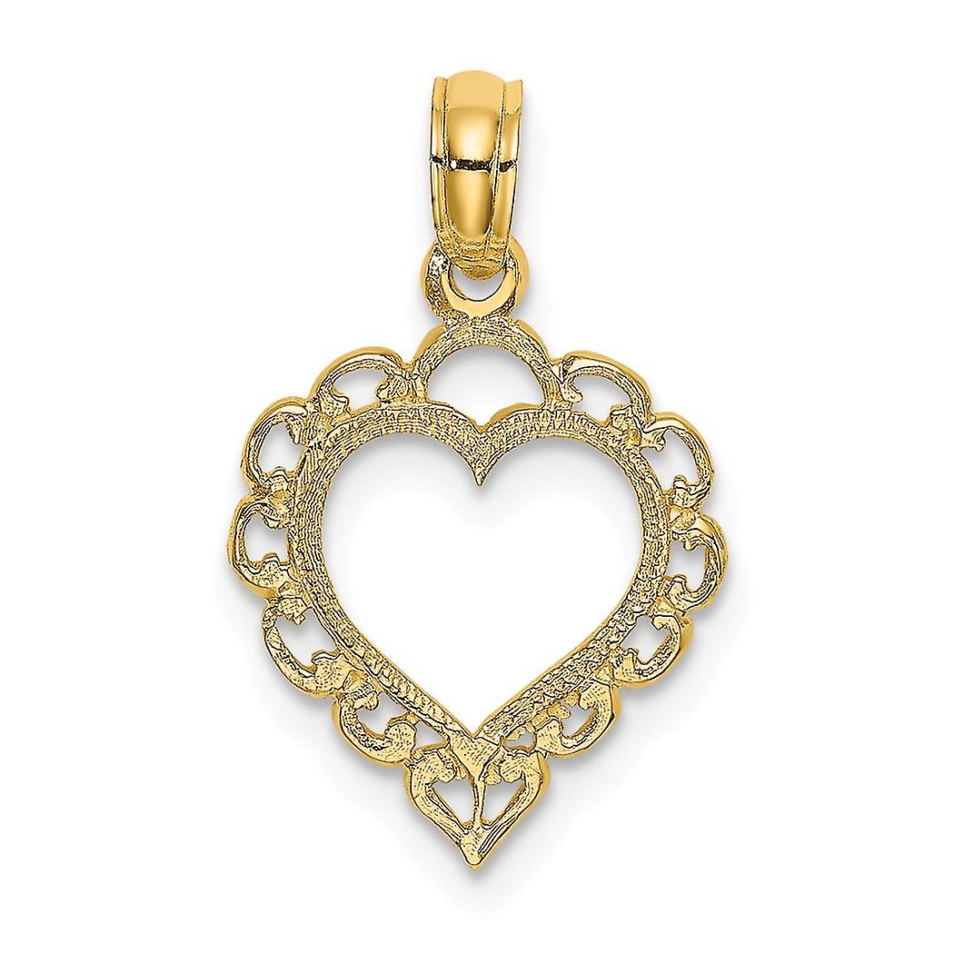 13mm 14k Gold Heart Pendant With Lace Trim - .5 Grams - - Charm/Element Width: 12.8 mm - Width of Item: 12.8 mm - Charm/Element Length: 14.33 mm - Length of Item: 18.33 mm - Bail Length: 5 mm - Bail Width: 4.5 mm - Finish: Polished - - This Item Does Not Ship With a Chain