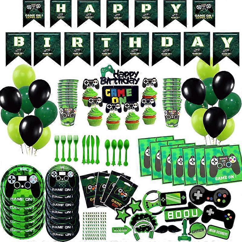 The 145-piece set includes: 10X7-inch plates, 10X9-inch plates, 10Xpaper cups, 10Xpaper towels, 1Xtablecloth, 10Xknives, 10Xforks, 10Xspoons, 1Xhappy birthday cake sticker, 10X1 game handle cake sticker, 1Xhappy birthday flag, 20Xlatex balloons, 2Xhandle aluminum balloons, 2X18-inch round aluminum balloons, 10Xgift bags, 18Xphoto props in a pack, 10Xpaper straws Perfect Design and premium material Easy to Use Our most popular option, ideal for the majority of our customers. Reminder: Due to reasons such as light and display resolution, the picture and the actual product may be slightly different, please refer to the actual product. Shipping from China.