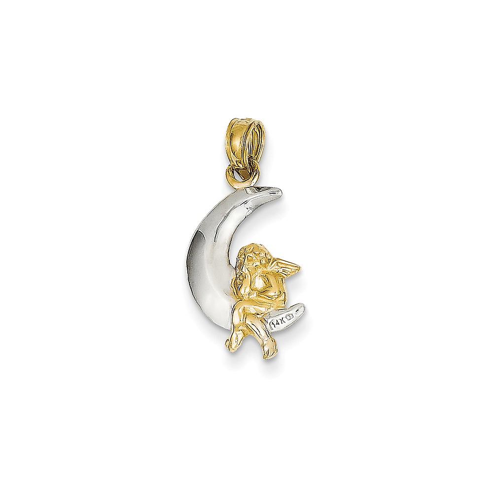 14k Yellow Gold and Rhodium Polished Celestial Moon With Religious Guardian Angel Pendant Necklace 17x11mm Wide-Pendant
