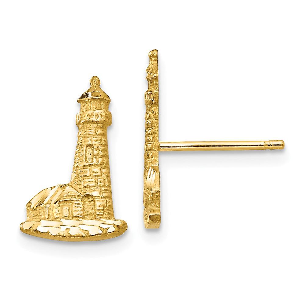 14k Yellow Gold Satin Textured Post Sparkle Cut Lighthouse Earrings 14x8mm Wide Stud Earring for Women