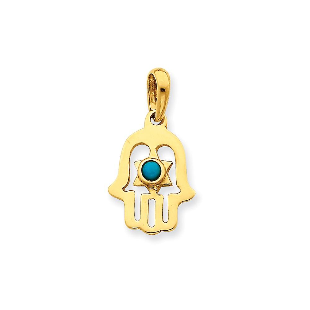 14k Yellow Gold Solid Polished Simulated Turquoise Chamseh Pendant Necklace 17x14mm-Pendant for Women
