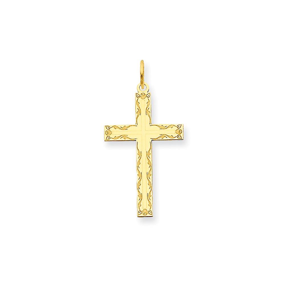 14k Yellow Gold Laser Designed Cross Pendant - Measures 13x25.6mm - .8 Grams in 14k Yellow Gold - - Product Attributes: - Laser Etched - Polished - Polished back - Solid - Stamped - - Charm/Element Width: 13 mm - Width of Item: 13 mm - Charm/Element Length: 26 mm - Length of Item: 26 mm - Finish: Polished & Laser Design - - This Item Does Not Ship With a Chain
