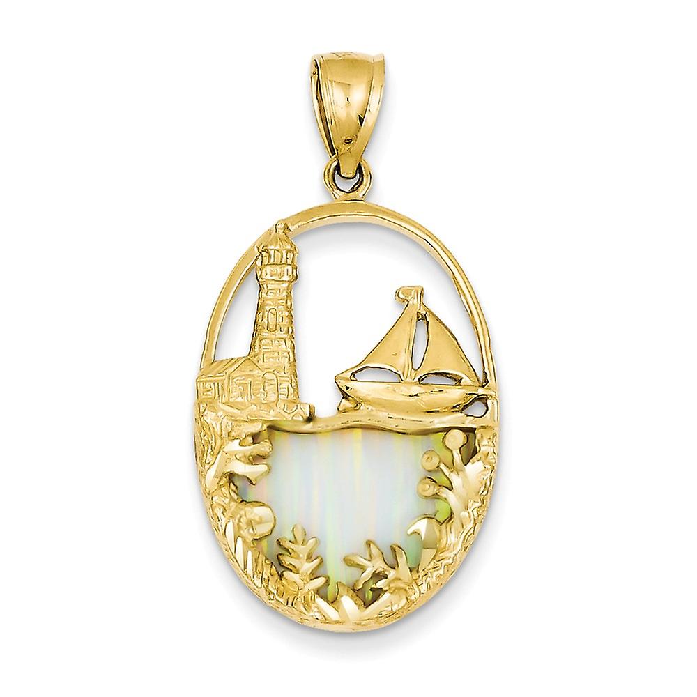 14k Yellow Gold Textured Polished Simulated Opal Lighthouse and Sailboat Pendant Necklace 37x19mm Wide-Pendant for Women