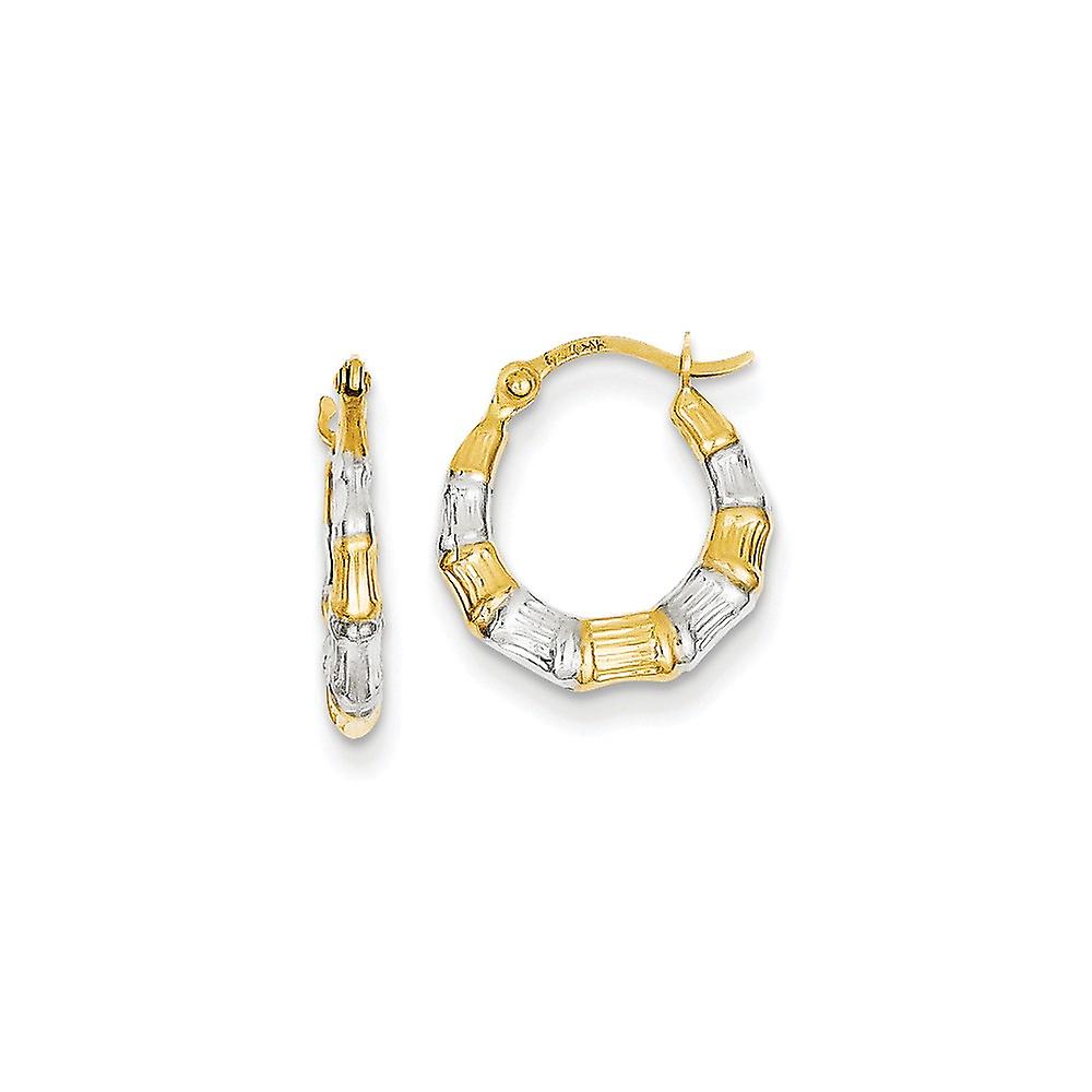 14k Yellow Gold Hinged post and Rhodium Hollow Bamboo Hoop Earrings 14x13mm Wide 3mm Thick-Hoop Earring for Women