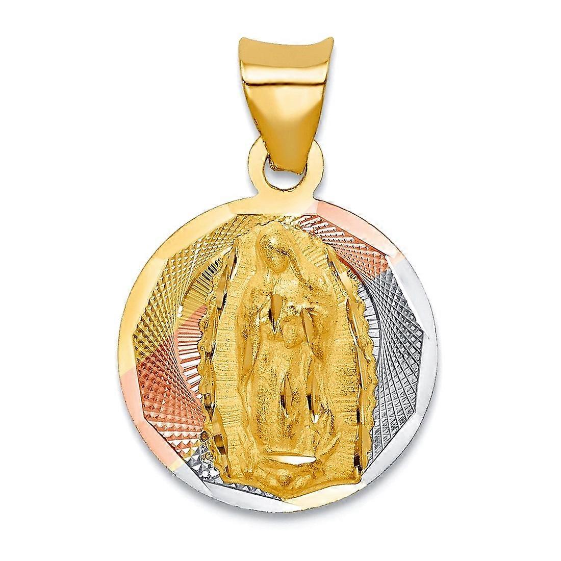 14k Yellow Gold Polished and satin and Rhodium-Polished And Sparkle Cut Lady Of Guadalupe Circle Pendant Necklace 19.3x1