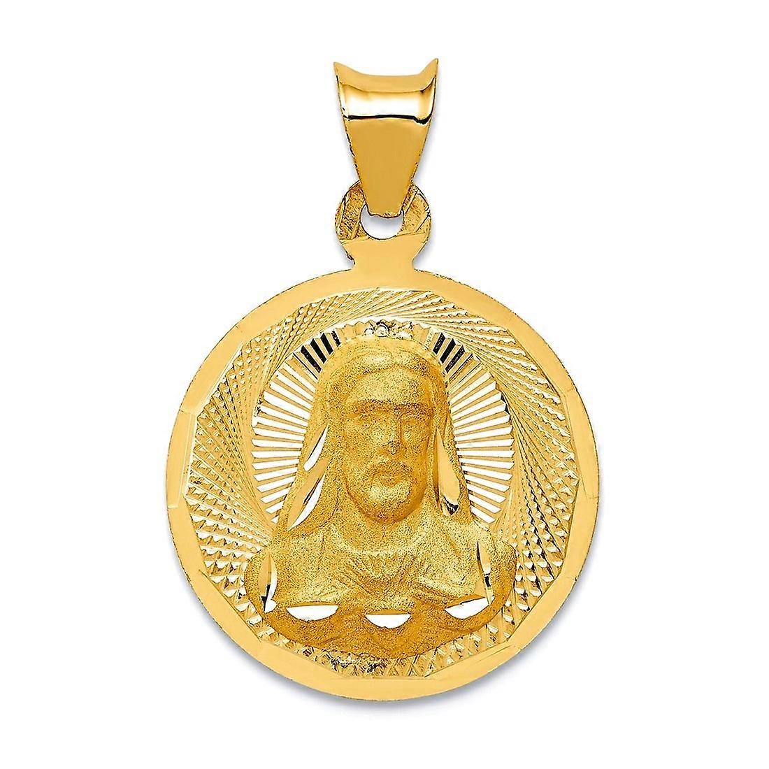 14k Yellow Gold Polished and Sparkle-Cut Sagrado Corazon Circle Pendant - in 14k Yellow Gold - Product Attributes: - Diamond Cut - Polished and satin - - Charm/Element Width: 16.3 mm - Charm/Element Length: 19.6 mm - Feature: Solid - - This Item Does Not Ship With a Chain