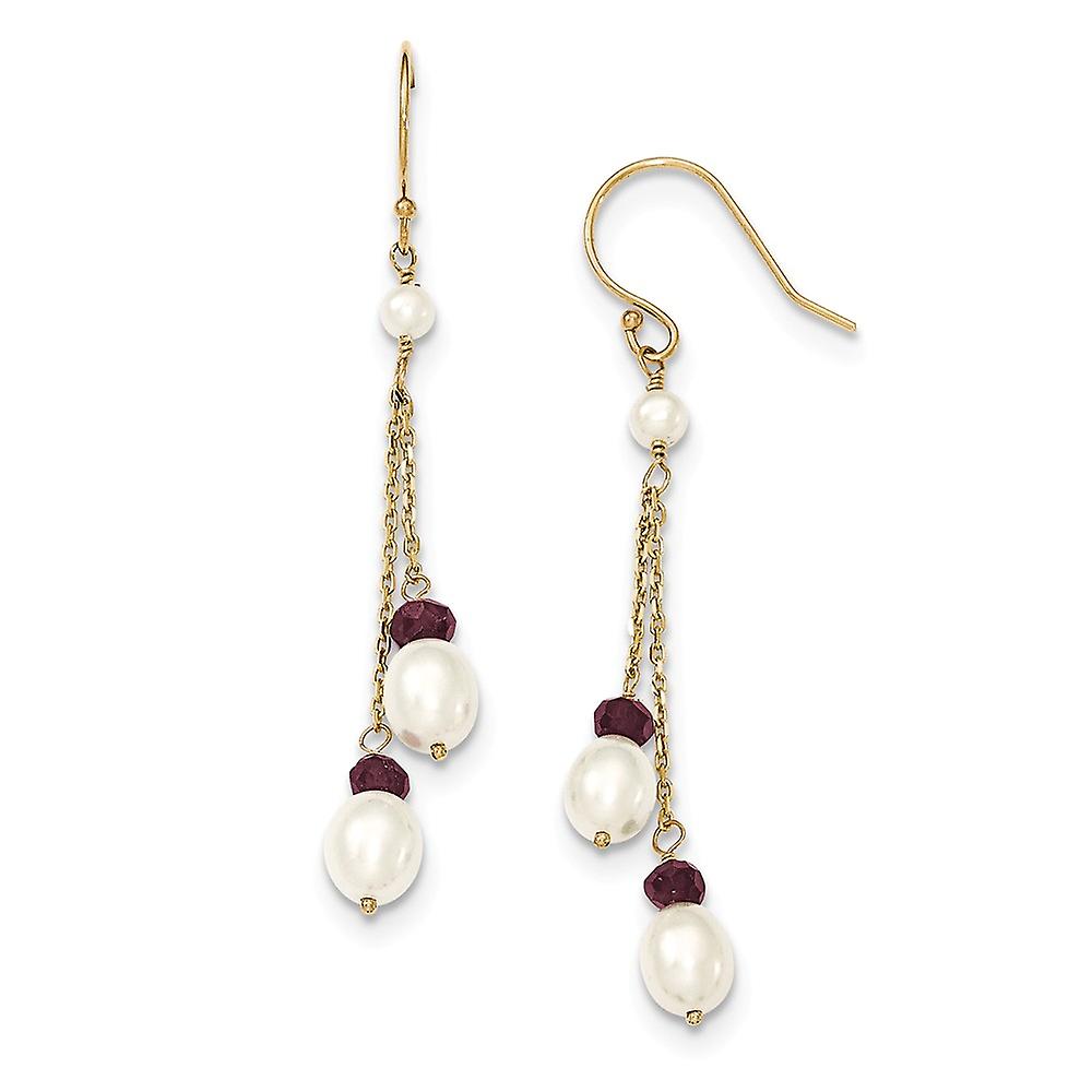14k Yellow Gold Polished Shepherd hook Freshwater-Freshwater Cultured Pearl and Garnet Double Chain Drop Earrings Measur
