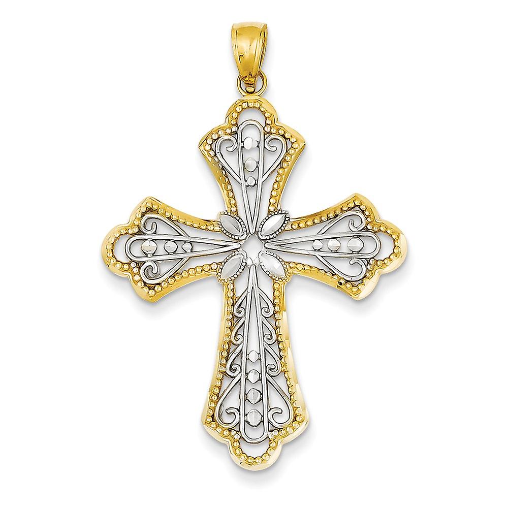 14k Yellow Gold Polished and Rhodium Sparkle Cut Filigree-Cut out Religious Faith Cross Pendant Necklace 45x30mm Wide-Pe