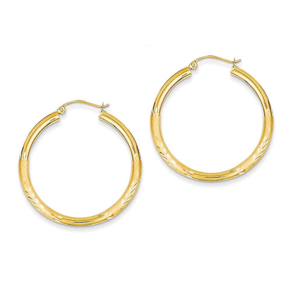 14k Yellow Gold Satin and Sparkle-Cut 3mm Round Hoop Earrings - Measures 35mm long 3mm Thick - 2.8 Grams in 14k Yellow Gold - Product Attributes: - Hinged post - Hollow - Polished - - Thickness: 3 mm - Width of Item: 3 - Length of Item: 35 mm - Earring Closure: Wire & Clutch - Earring Type: Hoop - Finish: Polished & Brushed - Feature: Hollow -