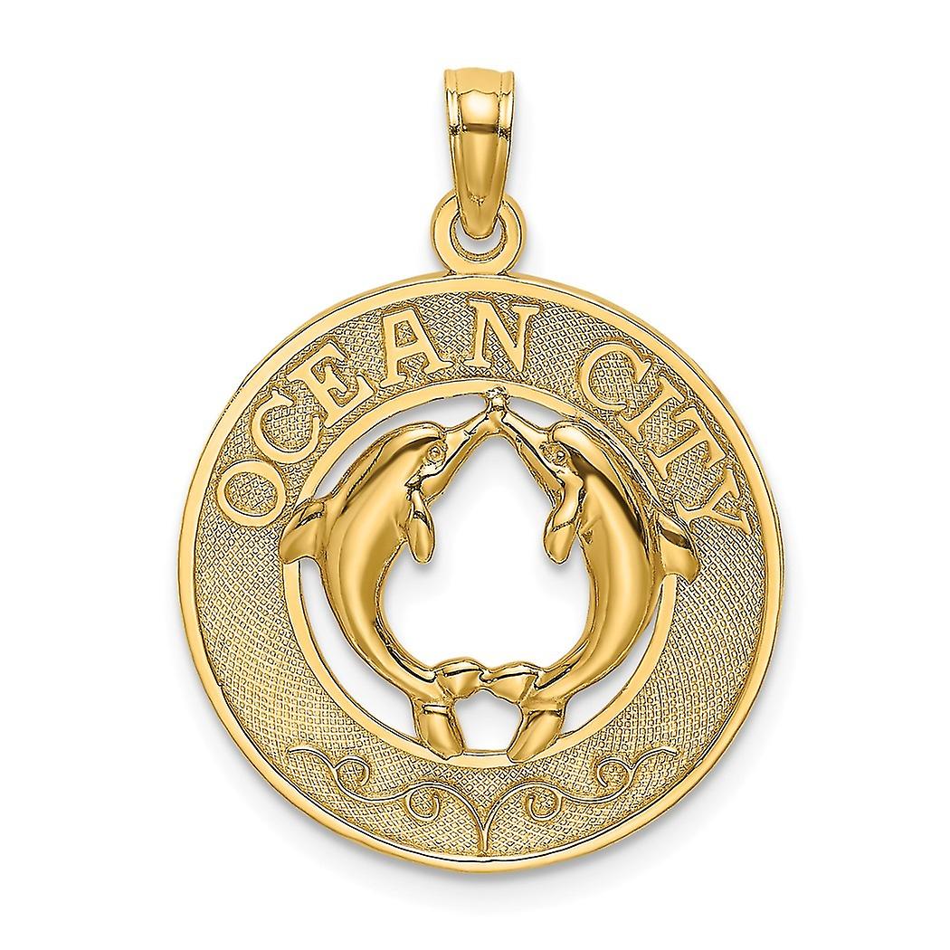 14k Gold Ocean City Round Frame With Dolphins In Center Charm 19.1x19.1mm Wide 2.6mm Thick Pendant Necklace for Women