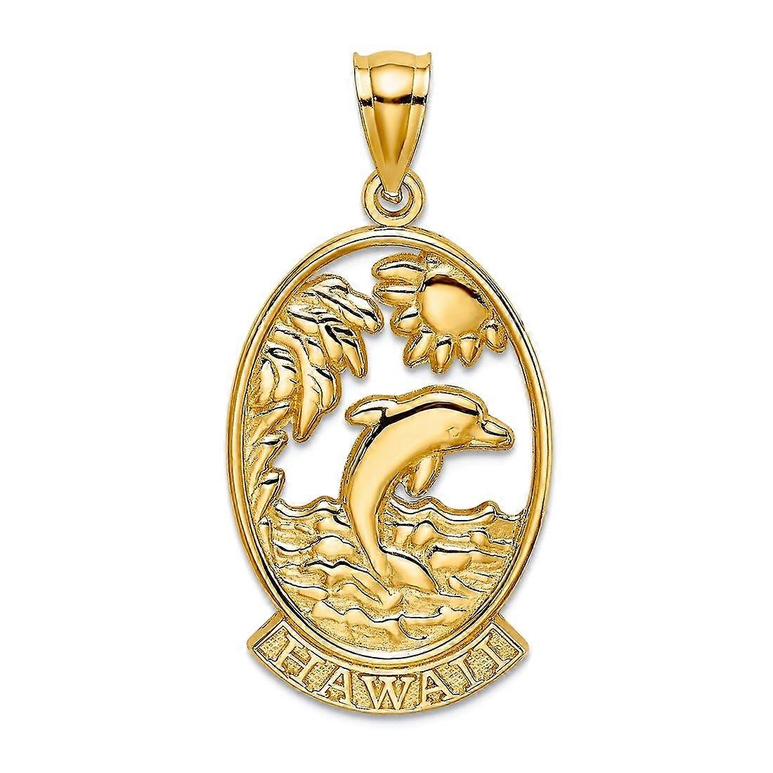 14k Gold Hawaii With Dolphin and Waves In Oval Charm 30.3x15.3mm Wide 1.25mm Thick Pendant Necklace for Women