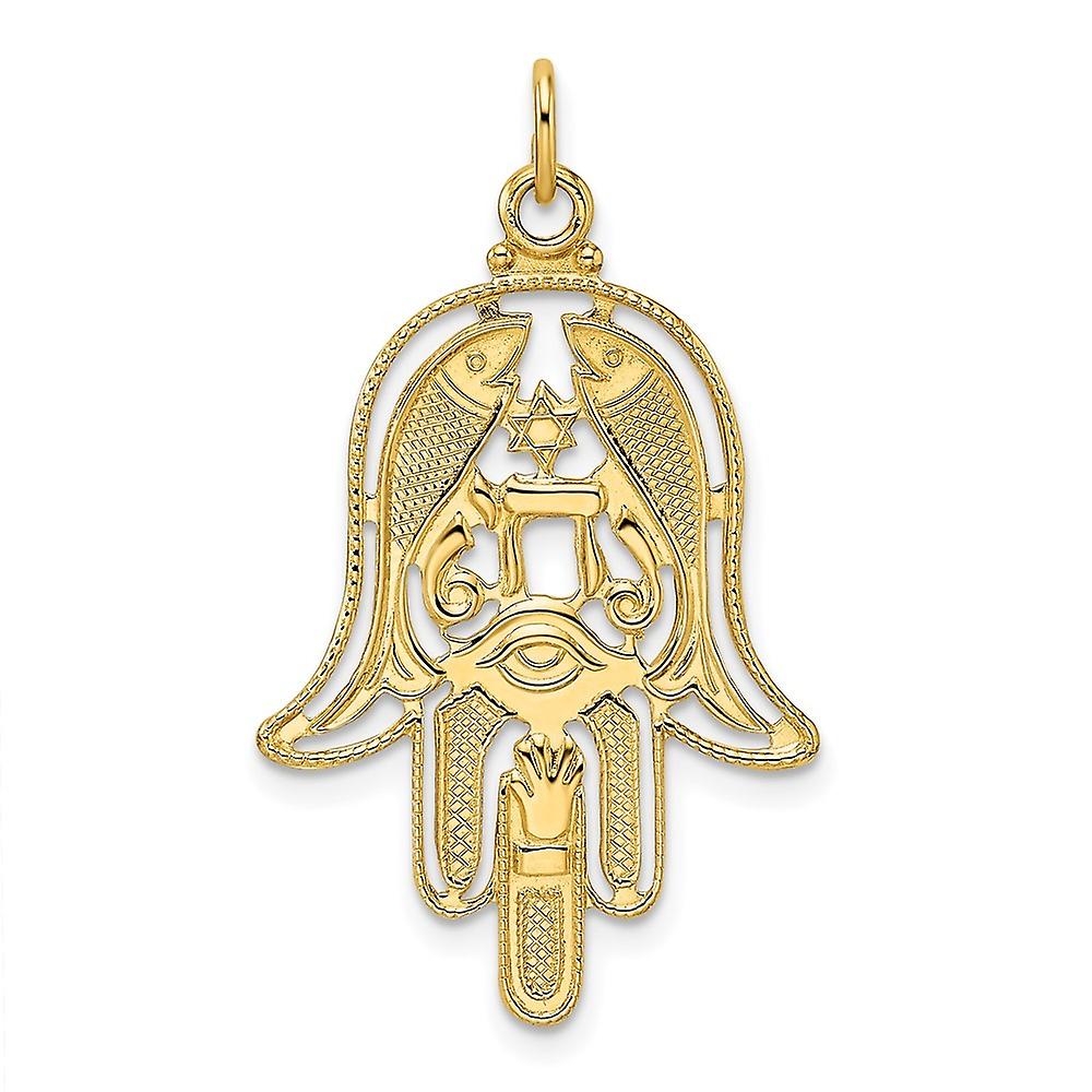 14k Gold Polished and Textured Solid Hamsa Pendant - Measures 34x20.5mm Wide 0.65mm Thick - 1.5 Grams In 14k Gold - - Charm/Element Width: 20.5 mm - Charm/Element Thickness: 0.65 mm - Width of Item: 20.5 mm - Charm/Element Length: 31.5 mm - Length of Item: 34 mm - Bail Length: 4 mm - Finish: Polished - Feature: Solid - - This Item Does Not Ship With a Chain