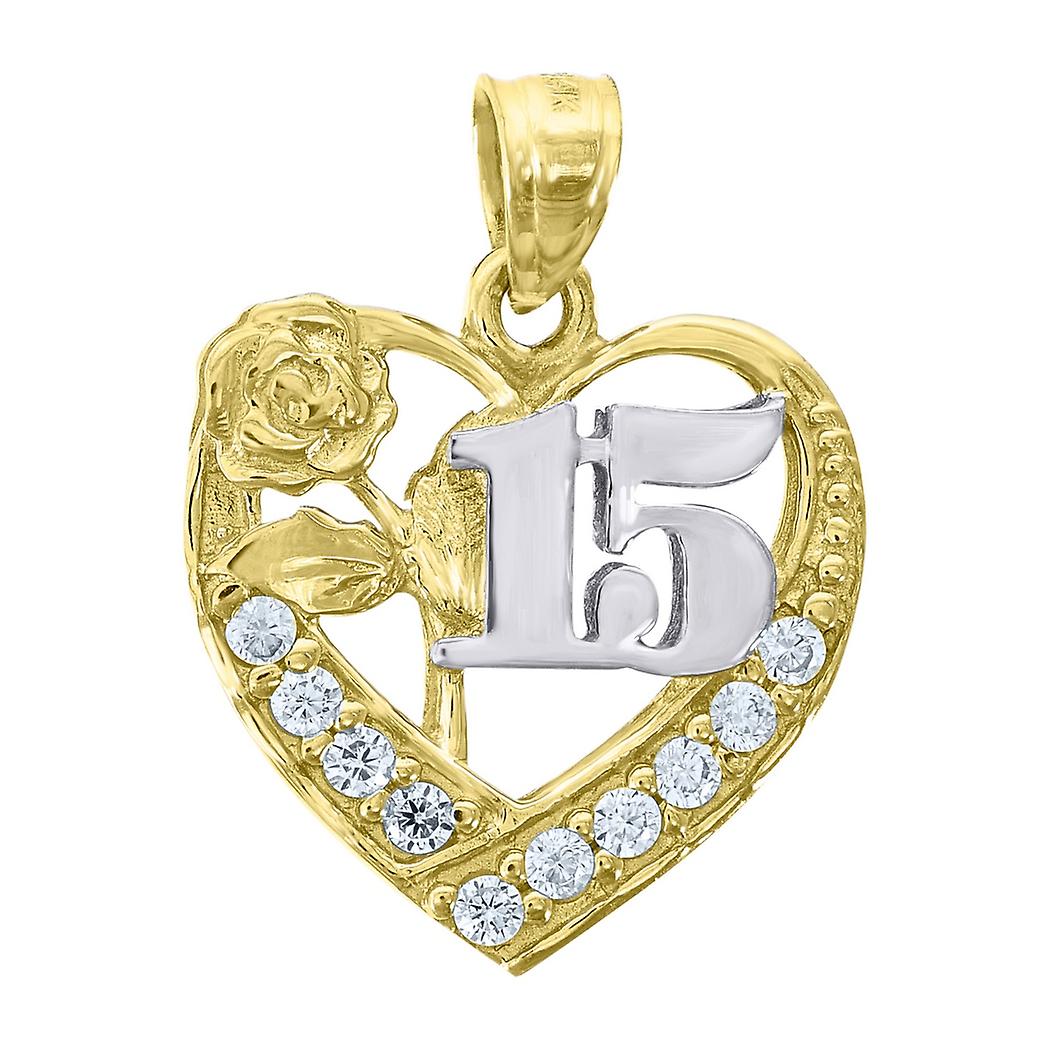 14k Gold Womens Two tone Cubic Zirconia 15 Anos Love Heart Quinceanera Height 20.1mm Pendant Necklace Charm-Pendant for