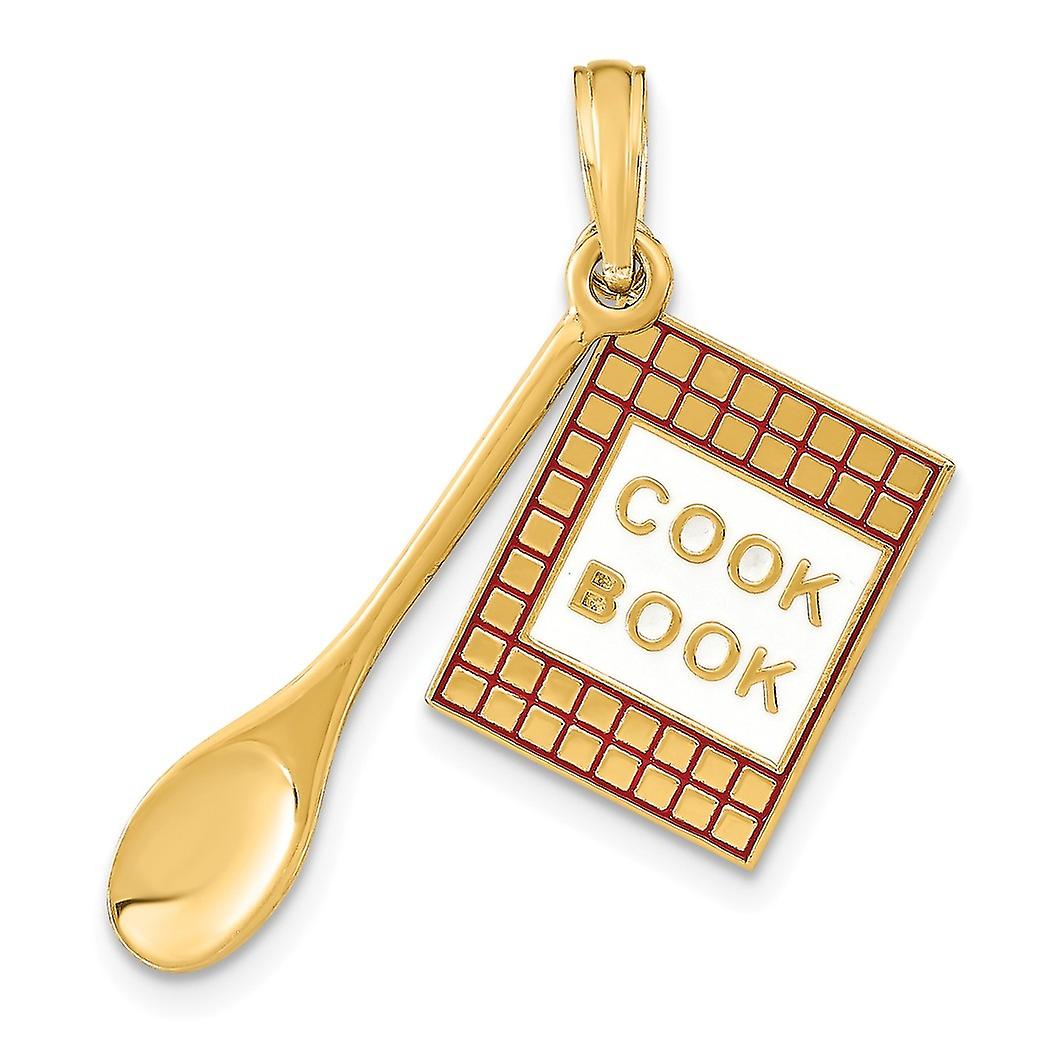 14k Gold 3 d Cook Book With Red Enamel and Wooden Spoon Charm 25.13mm Wide Pendant Necklace for Women