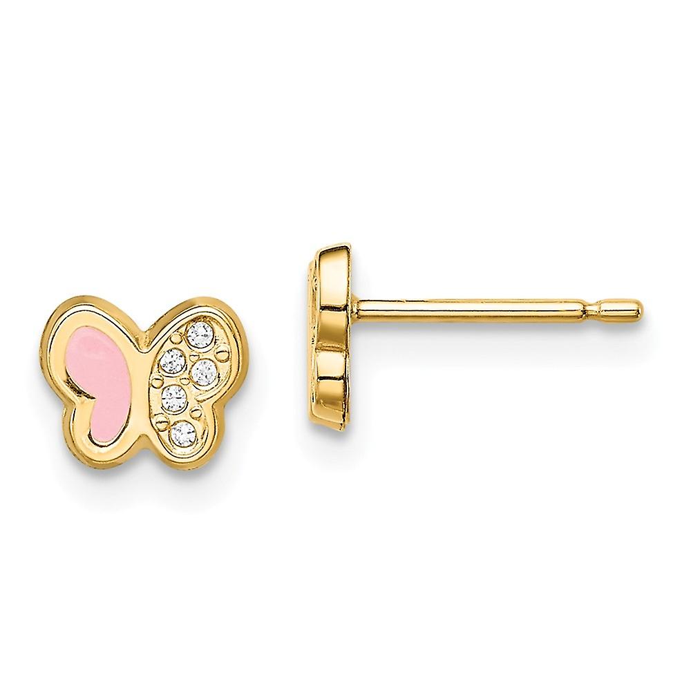 14k Solid Yellow Gold Cubic Zirconia Pink Enamel Butterfly Angel Wings Post Earrings 5.3mm long Stud Earring for Women