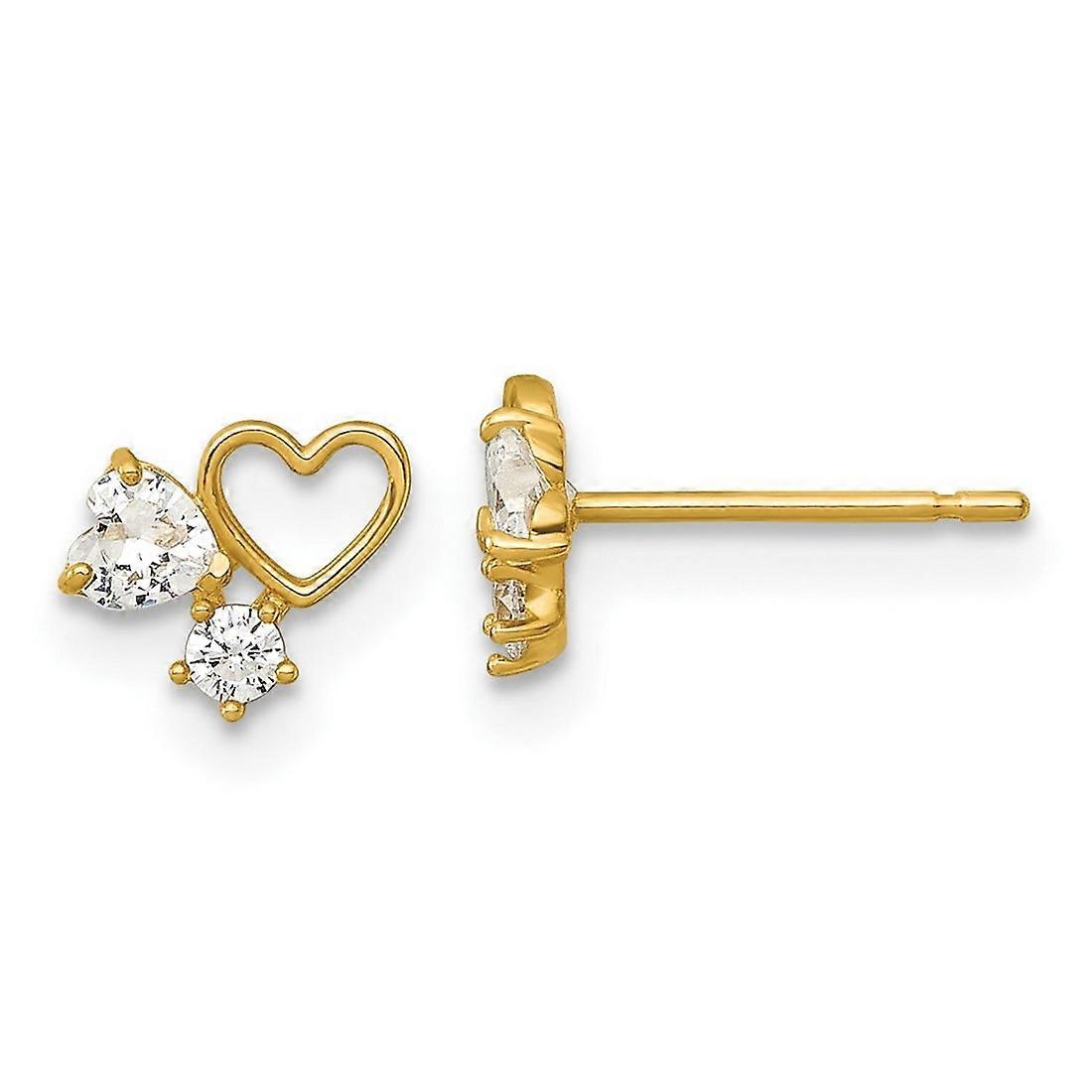7.45mm 14k Polished Cubic Zirconia Hearts Post Earrings - Measures 6.15x7.45mm Wide - .6 Grams In 14k Yellow Gold - - Width of Item: 7.45 mm - Length of Item: 6.15 mm - Earring Closure: Post & Push Back - Earring Type: Button - Finish: Polished - Feature: Childrens - - [ Potential Enhancement Methods: cubic zirconia ] - Synthetic. Some are covered with a product that makes the stone more durable. - [ Care and Handling: cubic zirconia ] - Clean with warm soapy water and a soft cloth. -