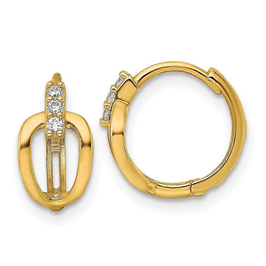 13.35mm 14k Polished Fancy Cubic Zirconia Hinged Round Hoop Earrings - Measures 12.7x13.35mm Wide 2.22mm Thick - 1.5 Grams In 14k Yellow Gold - - Thickness: 2.22 mm - Width of Item: 13.35 mm - Length of Item: 12.7 mm - Earring Closure: Post-Notch & Lock - Earring Type: Hoop - Finish: Polished - - [ Potential Enhancement Methods: cubic zirconia ] - Synthetic. Some are covered with a product that makes the stone more durable. - [ Care and Handling: cubic zirconia ] - Clean with warm soapy water and a soft cloth. -